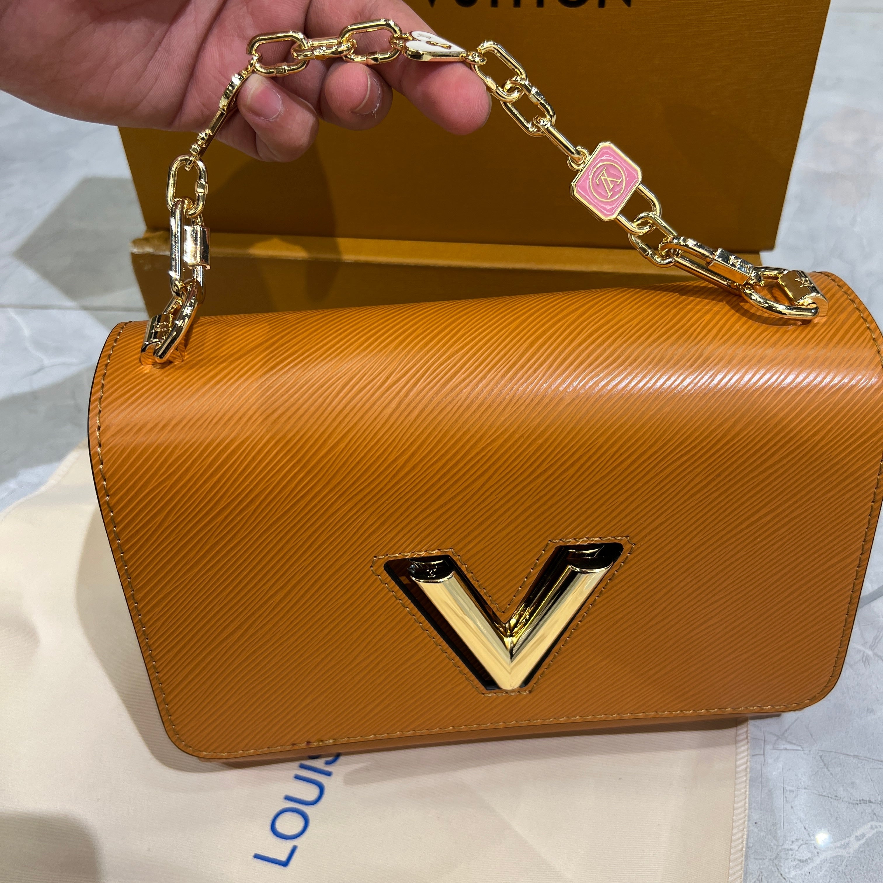 Rich amber toned box bag with a chic handle detail, perfect for adding a pop of color to your wardrobe.