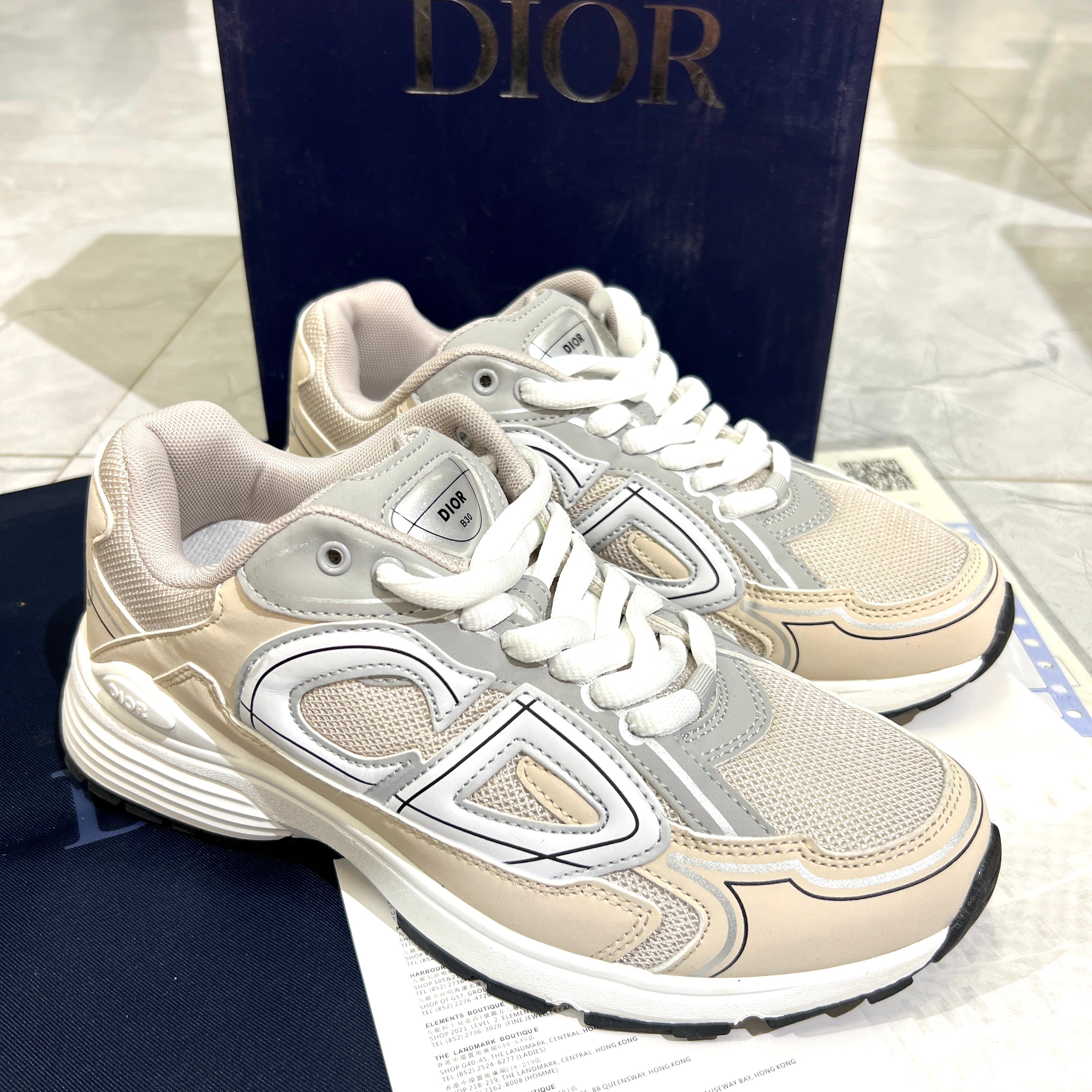 Dior B30 sneakers in an Cream Mesh color. These sneakers feature a mesh and technical fabric upper with reflective details, including the "DIOR" branding on the side and a "DIOR B30" label on the tongue. They have a chunky sole and a lace-up closure.