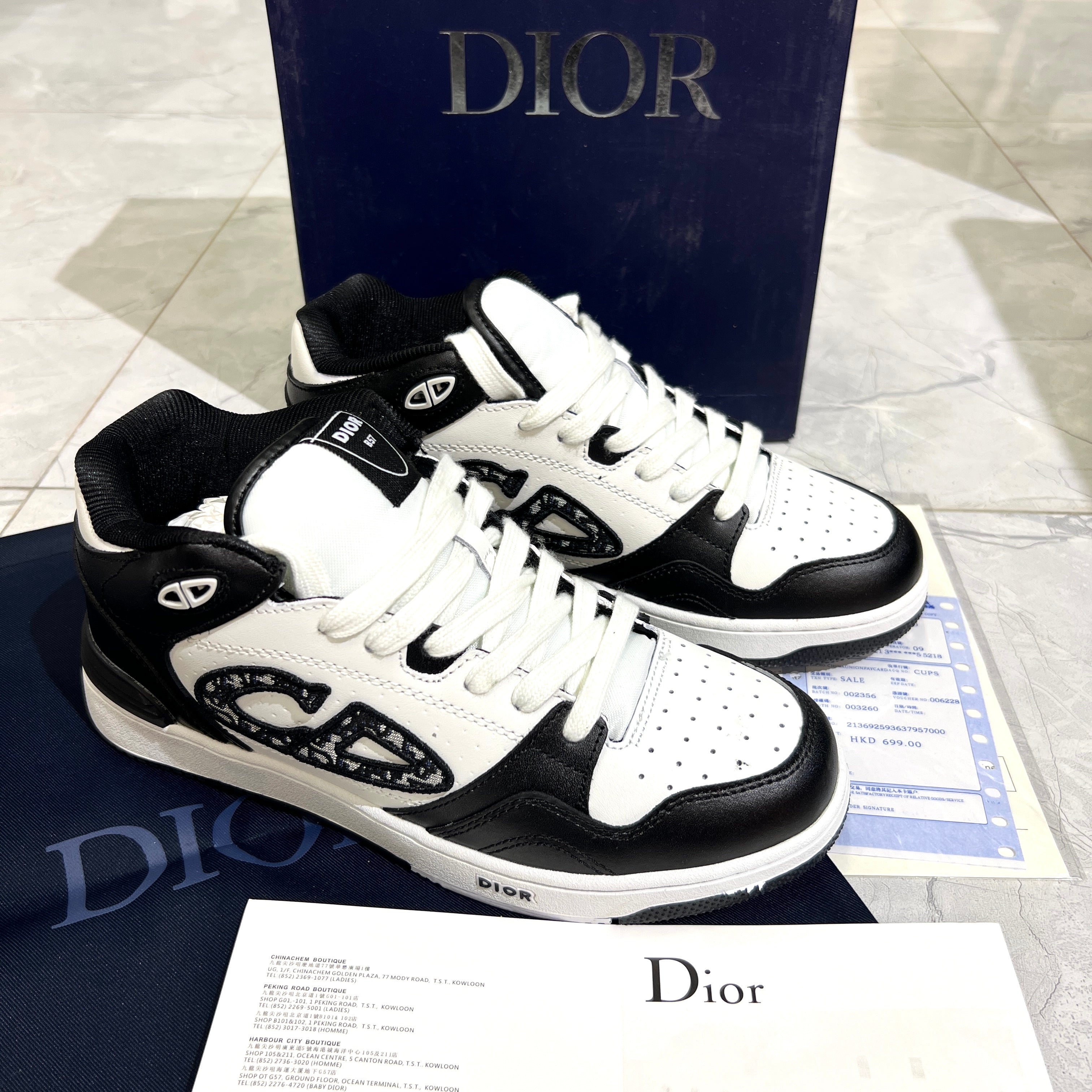 They are recognizable by the oversized "CD" logo on the side and the sporty mesh-leather design. This model is one of Dior’s popular luxury sneakers.