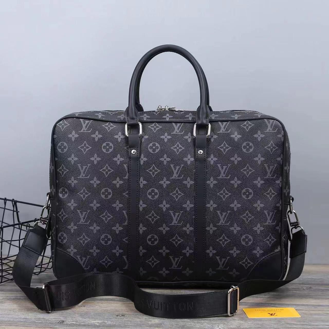 A stylish Louis Vuitton Monogram Eclipse Canvas Briefcase, designed with a sleek black and grey monogram pattern. It features dual leather handles, a detachable adjustable shoulder strap, and a spacious zippered main compartment—perfect for work, travel, or everyday sophistication.