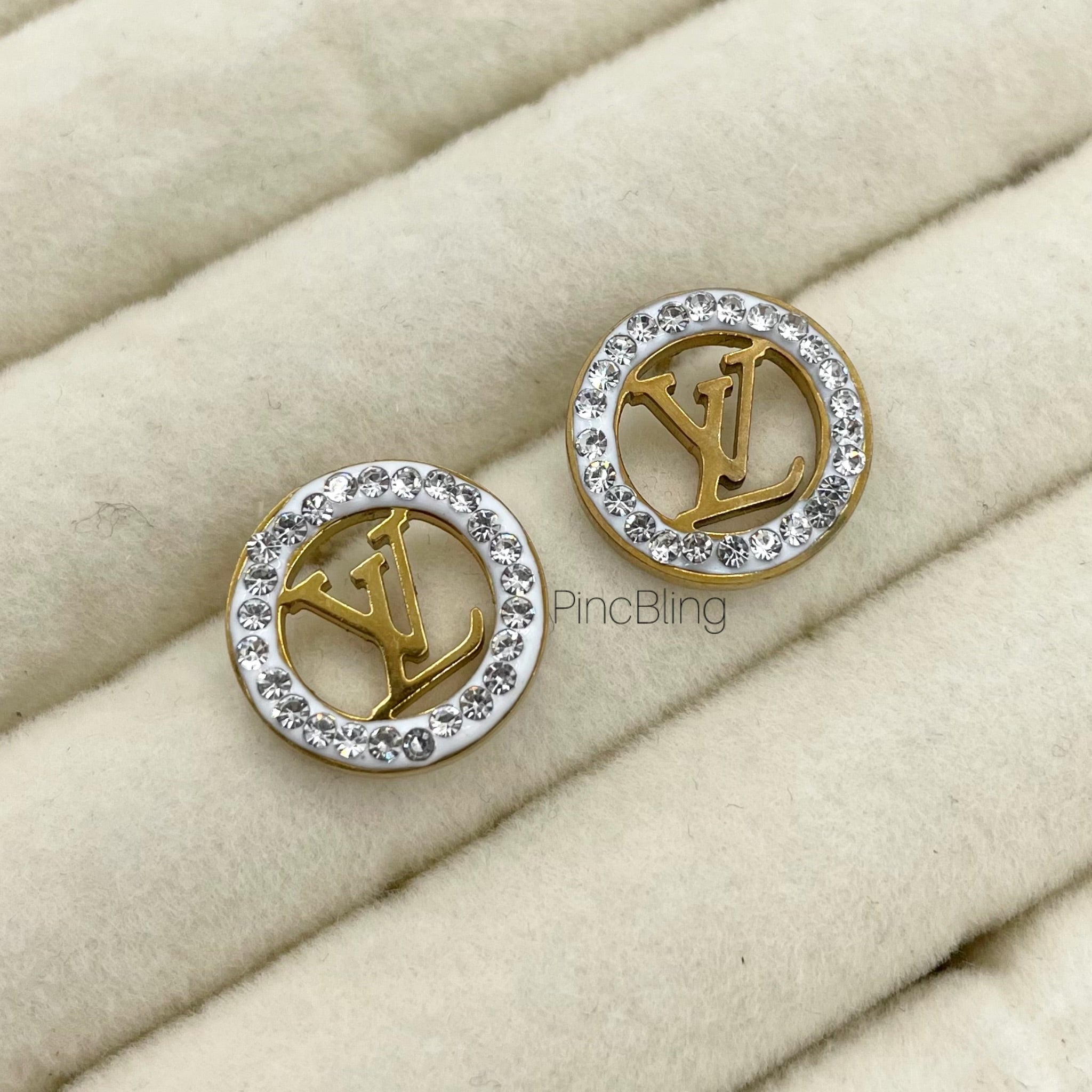 Circle studs with crystal borders and an initial inside.