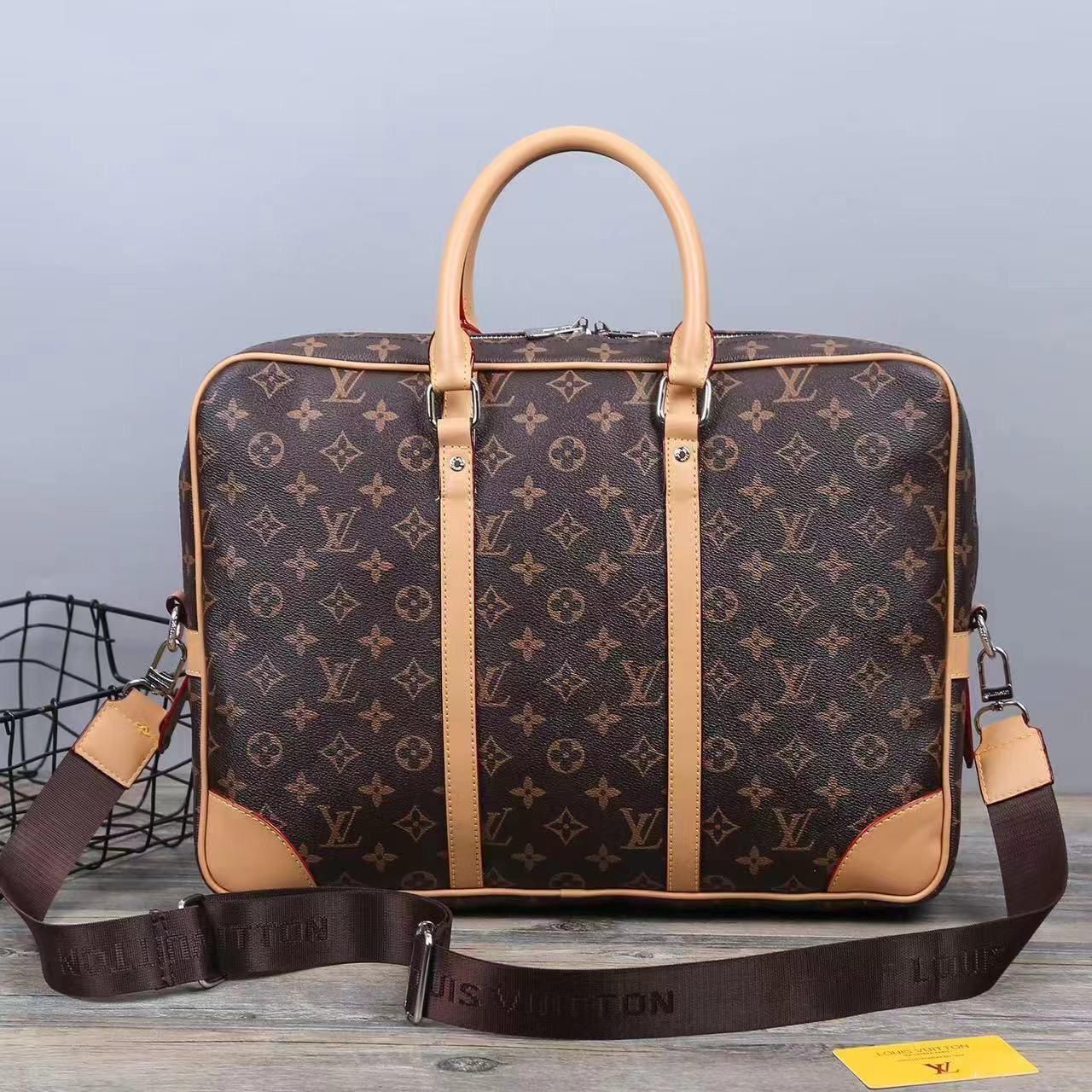 A stylish Louis Vuitton Monogram Eclipse Canvas Briefcase, It features dual leather handles, a detachable adjustable shoulder strap, and a spacious zippered main compartment—perfect for work, travel, or everyday sophistication.